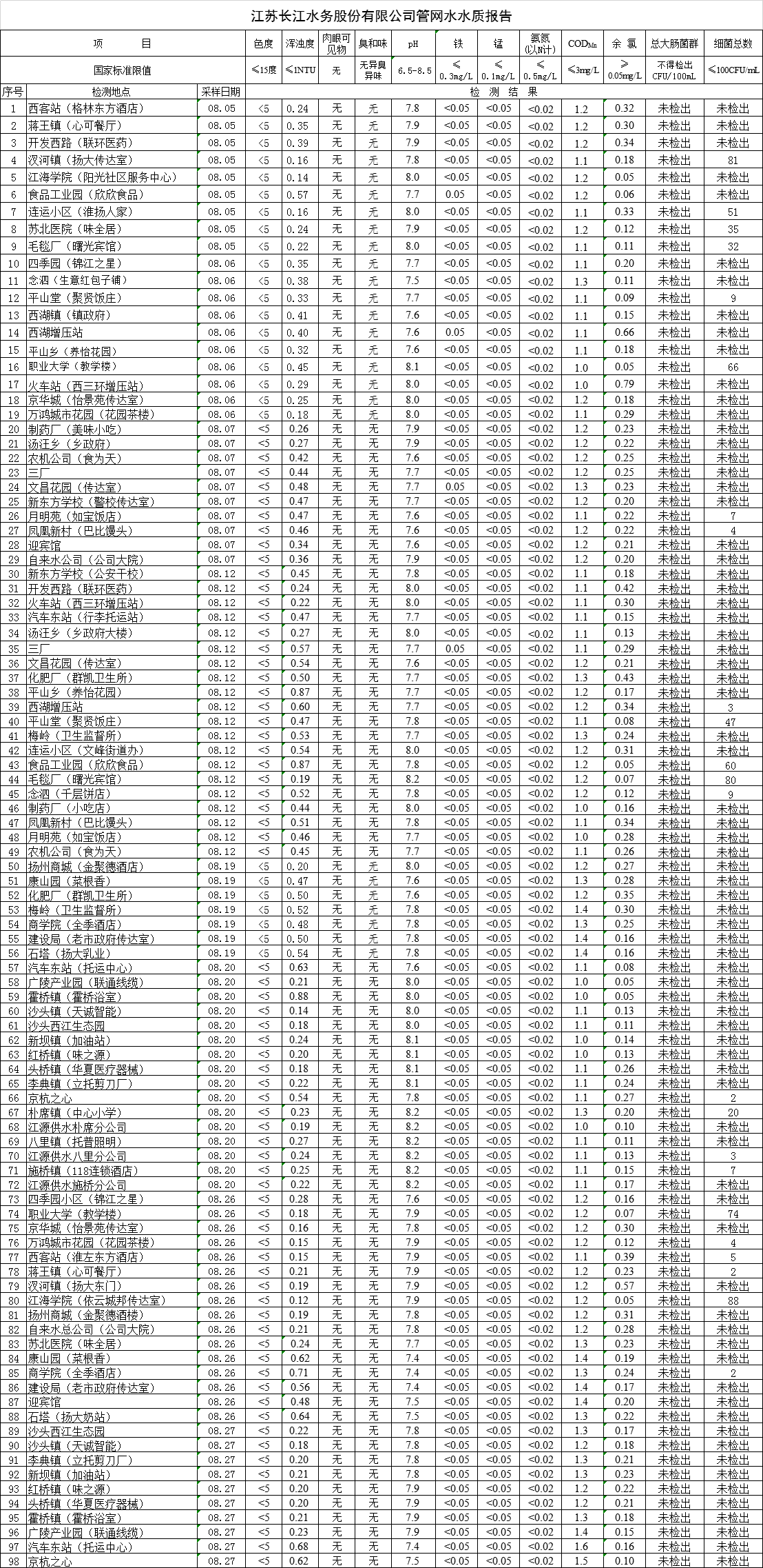 江蘇長江水務股份有限公司管網水水質報告(2019年8月)