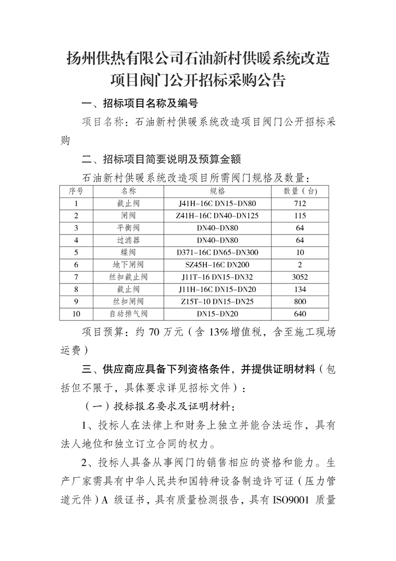 揚州供熱石油新村供暖系統改造閥門招標文件.docx