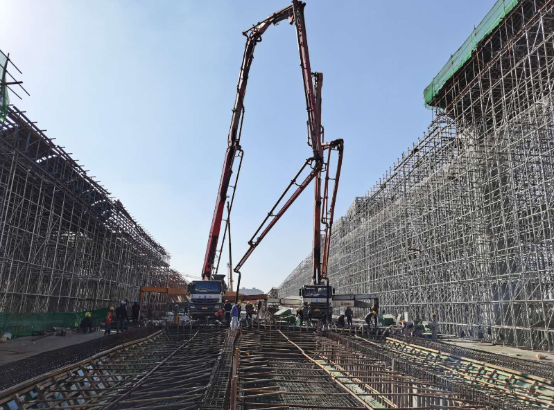為保證項目工期,項目部統籌兼顧,積極謀劃,在保證橋面附屬工程施工的同時,也保證了箱梁施工工作的穩步推進。每一次澆筑前,對施工班組進行質量安全技術交底,嚴格過程控制和工序銜接,確保工程質量;現場施工嚴格按照專項方案,現場技術負責人對每道工序進行嚴格審核,牢牢把關,以“高標準,嚴要求”進行每道工序的驗收;項目成立黨員先鋒隊和青年突擊隊,黨員領導干部沖鋒在前,全體參建人員迎難而上,緊盯節點,細化措施,落實責任,強力推動工程順利進展;同時,現場施工人員積極主動爭取一切有利條件,攻堅克難,搶抓時機,多措并舉,合理配置資源,全力保障每一聯現澆箱梁的順利澆筑。此次主線現澆箱梁的澆筑完成,為項目全面進入附屬工程施工、完成整體目標任務奠定了堅實的基礎。截止日前,工程全部66聯現澆箱梁,已澆筑61聯;支架已全部搭設完成;附屬工程防撞護欄已完成9800米,完成64.1%;橋面鋪裝已完成48聯,完成64%;正在進行瀝青攤鋪準備工作,各工序施工正穩步推進中。