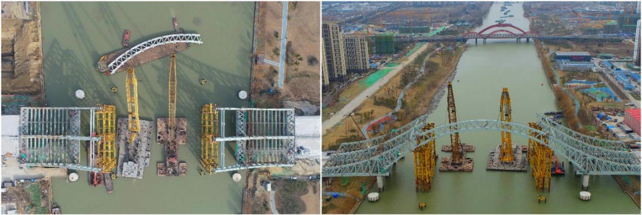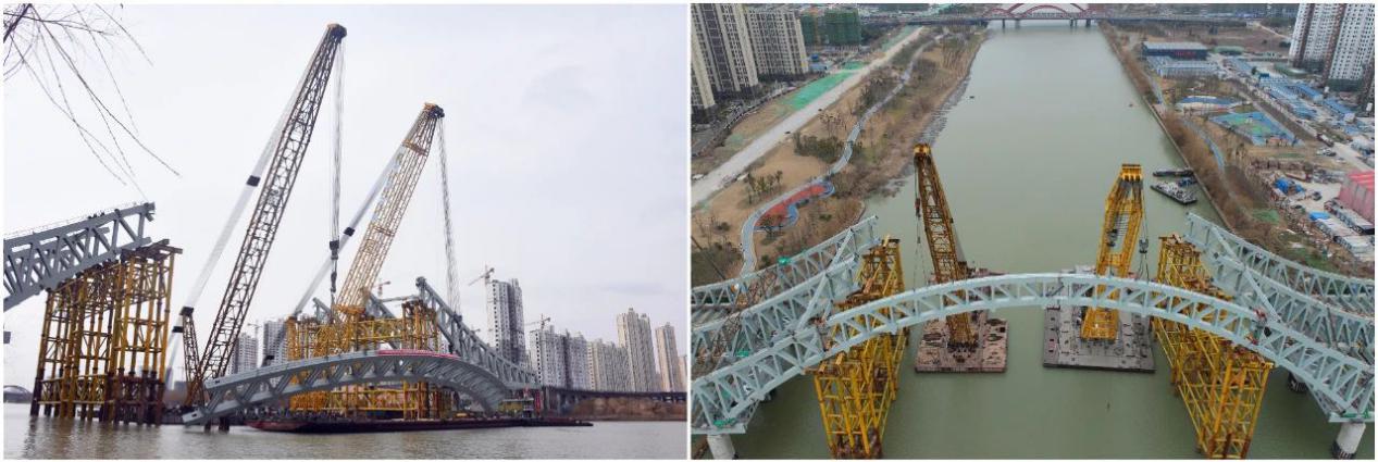1月16日,萬福快速路跨京杭運河大橋拱肋首節(jié)合龍段順利吊裝,大橋初現(xiàn)剛柔并濟的精美弧線造型。