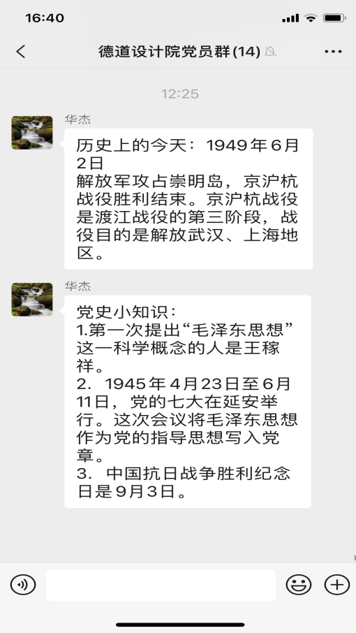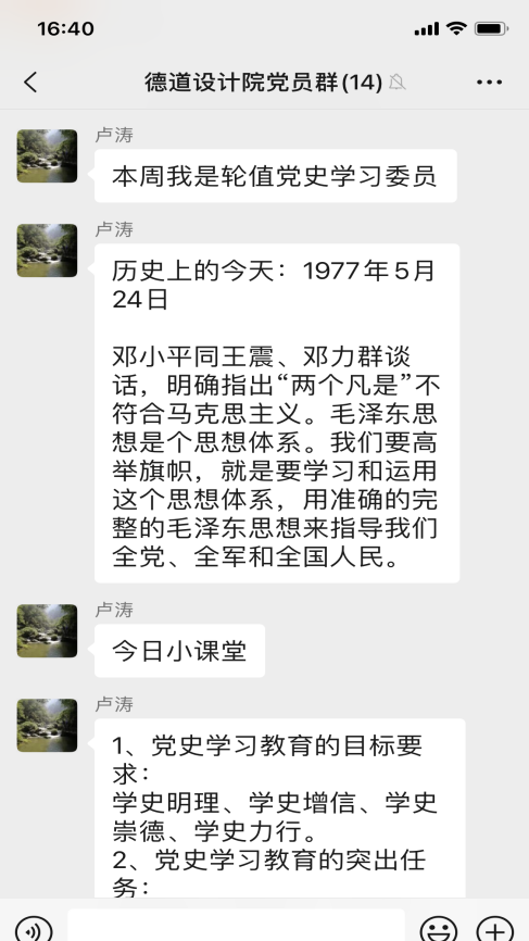 近日,為提升學(xué)史學(xué)習(xí)教育的實(shí)效性,設(shè)計(jì)院支部創(chuàng)新思路,結(jié)合工作的特殊性,以“黨員學(xué)習(xí)群”為載體,開展“輪值學(xué)習(xí)委員領(lǐng)學(xué)”活動(dòng),排出學(xué)習(xí)委員輪值表,支部委員帶頭,黨員跟上,每周由一名“學(xué)習(xí)委員”,帶領(lǐng)大家開展黨史線上學(xué)習(xí)。輪值學(xué)習(xí)委員在值班日當(dāng)天利用中午時(shí)間,通過微信群,“敲黑板、劃重點(diǎn)”,發(fā)布“歷史上的今天”和“今日小課堂”兩個(gè)版塊的學(xué)習(xí)內(nèi)容。“歷史上的今天”展示了中國(guó)共產(chǎn)黨和新中國(guó)成立以來重大事件。“今日小課堂”每日推送三條黨史學(xué)習(xí)教育內(nèi)容,讓支部每個(gè)黨員在靈活時(shí)間內(nèi)完成學(xué)習(xí),汲取知識(shí)。