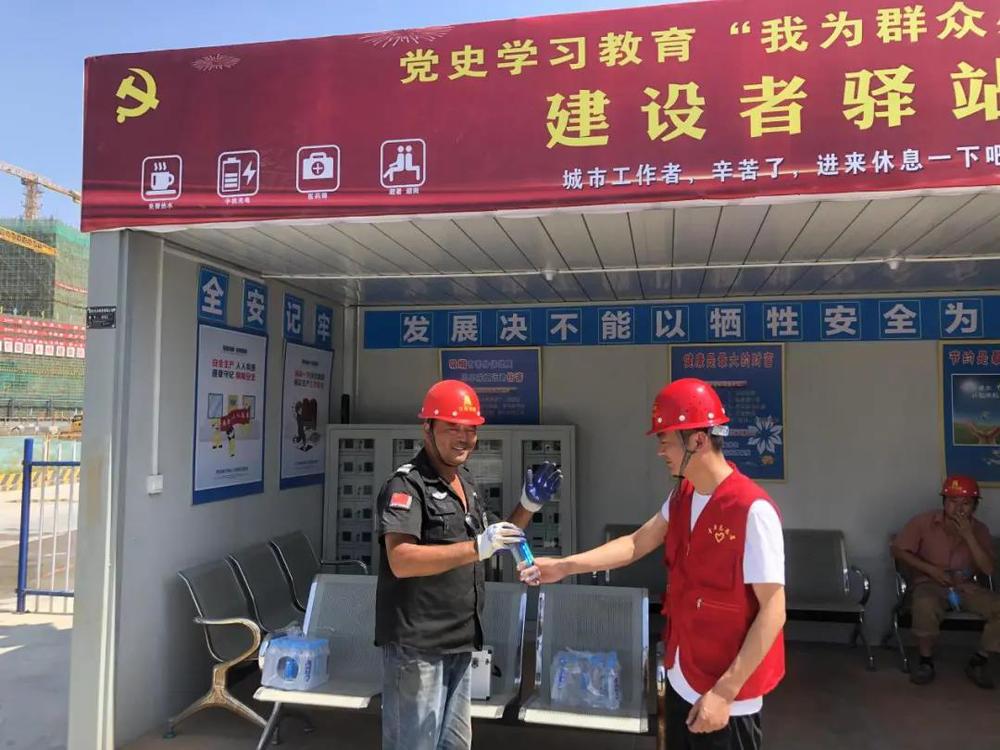 “建設者驛站”是城建置業公司黨支部籌劃為群眾辦實事、提供對外服務的一個穩定且持久的志愿服務平臺。項目現場,烈日當空,滿頭大汗的建筑工人們在黨員志愿者的引導下前往驛站納涼休息、喝水飲茶,在接過志愿者及時遞過來的純凈水時,他們被烈日灼紅的臉上綻開了憨厚淳樸的笑容。支部負責人在詳細了解一線工人的工作生活情況以及防暑降溫措施后,現場給大家發放了大麥茶、清涼飲料、醫藥包等防暑降溫物品,他對施工人員克服高溫天氣影響,堅守崗位認真工作表示感謝,一再叮囑大家要始終把安全和健康放在首位,項目部要切實關心一線職工,組織好錯峰作業施工,認真落實防暑降溫措施,為廣大戶外勞動者送安全、送清涼,預防夏季生產安全事故發生,確保企業安全生產和項目建設有序推進。