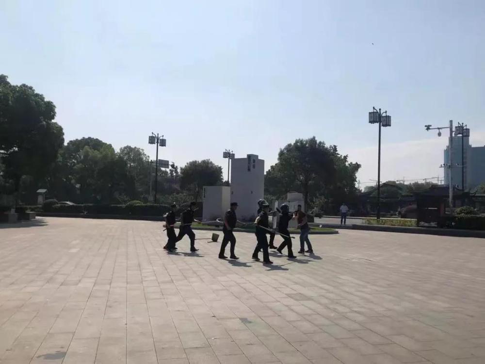 演練現(xiàn)場,烈日當(dāng)空,街區(qū)廣場出現(xiàn)了一名手持砍刀的“暴徒”,接到警情后,街區(qū)立即啟動(dòng)防暴應(yīng)急預(yù)案,現(xiàn)場總指揮一聲令下,數(shù)名保安攜帶鋼叉、盾牌、警棍等裝備迅速趕到事發(fā)現(xiàn)場,經(jīng)過一番搏斗,成功將“暴徒”制服,保障了顧客人身安全。