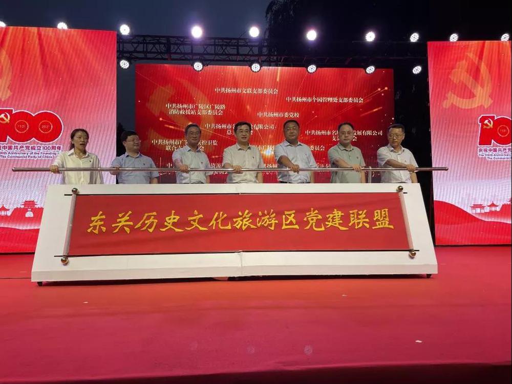 為慶祝中國共產黨成立100周年,進一步推進黨史學習教育深度融入古城文化,構建共治共建共享的社會治理新格局,打造由黨建領航、聯盟助力的歷史文化旅游景區。6月29日晚,在東關街東門廣場,由市名城公司和東關街道黨工委牽頭發起,市名城公司機關支部、旅發支部、長樂客棧支部協同10家單位黨支部,共同舉辦主題為《永遠跟黨走·起航新征程》慶祝建黨100周年文藝演出暨東關歷史文化旅游區黨建聯盟的成立儀式。省水文水資源勘測局揚州分局領導、市稅務局領導、廣陵區委組織部、宣傳部領導、市名城公司領導、東關街道相關領導以及其他共建單位相關領導共同出席儀式。