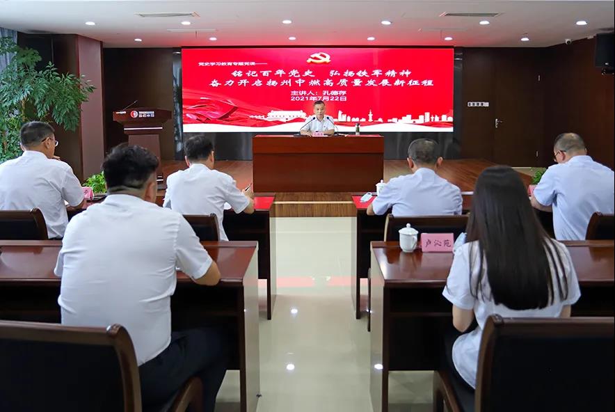 根據集團黨委統一部署,7月22日下午,揚州中燃開展領導干部黨史學習教育專題黨課宣講,集團黨史學習教育第三巡回指導組列席會議,并對黨課質量和效果進行現場測評。公司總經理主持宣講,黨委班子成員、中層干部、黨員代表參加活動。
