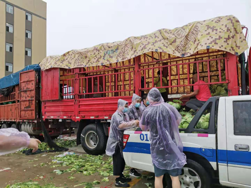 14:30,天空開始飄起雨點,大家依舊堅守在各自的崗位上,很快雨點就打濕了衣服和頭發(fā),可現(xiàn)場沒有一個人退下躲雨?!斑@車卸得差不多了,我們?nèi)ツ沁厧兔Α保摆踅瓍^(qū)轉(zhuǎn)運蔬菜的車來了,需要10個人裝車”,“我去”“我也去”,現(xiàn)場只有時不時這樣的聲音傳來。