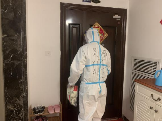 說干就干,大家迅速翻找出此前已經整理好的業主資料和信息,從中挑選出空巢老人住戶和封閉隔離住戶,然后換上防護服,推上小推車,前往各樓棟,進行分發。分發時,還細心詢問了業主的口味,盡量滿足大家的喜好。