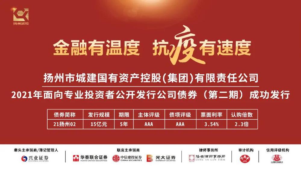 近日,城控集團(tuán)2021年第二期15億元公司債成功簿記發(fā)行,期限5年,票面利率3.54%,創(chuàng)集團(tuán)2017年以來(lái)同期限債券發(fā)行利率新低!本期債券募集資金將用于集團(tuán)民生保供、日常經(jīng)營(yíng)等。