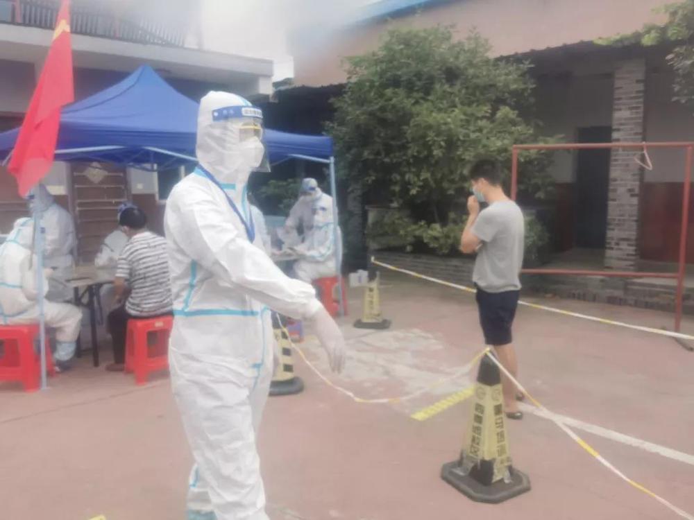 8月7日,一夜之間,揚(yáng)州增加了確診患者52例,其中有20例都是發(fā)生在武塘社區(qū),武塘社區(qū)居民談“疫”色變。當(dāng)天上午,志愿服務(wù)隊(duì)負(fù)責(zé)在武塘社區(qū)四季園菜場核酸檢測點(diǎn)維持居民核酸檢測秩序。從早上8點(diǎn)開始,檢測點(diǎn)兩側(cè)就排起了長長的隊(duì)伍,“兩個(gè)人負(fù)責(zé)喊居民準(zhǔn)備好身份證和健康碼,其他人都去維持秩序,保持兩米距離,不能讓群眾過于聚集,動(dòng)作迅速!”隊(duì)員們一邊做好檢測物資的運(yùn)送,一邊迅速開展了對核酸檢測隊(duì)伍秩序維護(hù)工作。