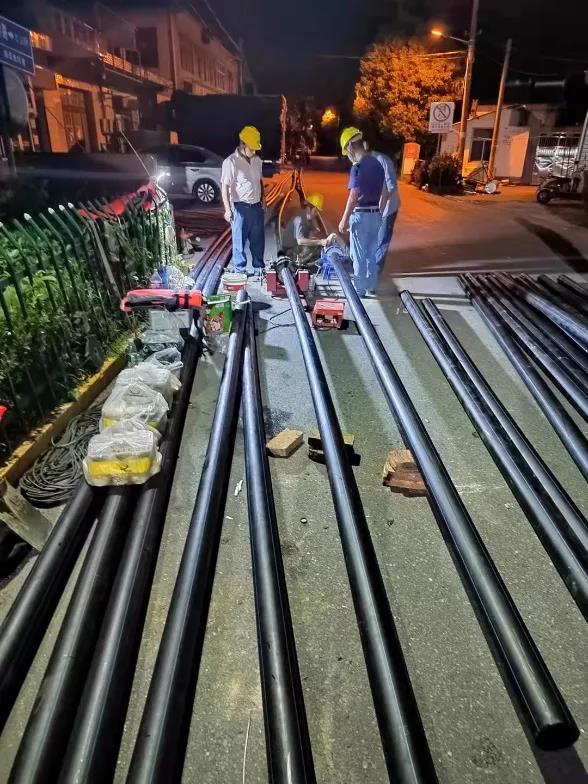 與此同時,長江水務公司抓緊勘察設計,制定出最快的恢復供水方案:采用最安全、最先進、最快速的拖管工藝新裝過河管道,選用最優質材料的PE管材。施工人員爭分奪秒與時間“賽跑”,他們冒著35度的高溫,晝夜不間斷施工26小時,克服河面寬、水流急、河床深等諸多不利因素,在水下18米實施拖管作業,把500多米長的管道鋪設到河對岸的山河村。9月12日下午6點,完成管道碰接恢復供水,并進行管道沖洗、水壓測試,居民安全用上了自來水。