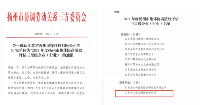 9月29日,揚州市協(xié)調(diào)勞動關(guān)系三方委員會公布“2021年度揚州市集體協(xié)商質(zhì)效評估三星級企業(yè)”名單,江蘇長江水務(wù)股份有限公司名列其中。