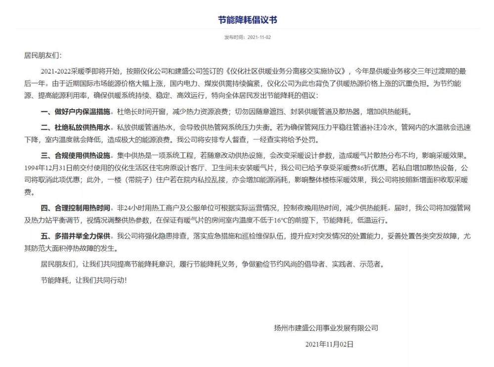 廣泛宣傳引導,合力提升采暖效果。今年是公司供暖業務移交三年過渡期的最后一年。面對今冬能源緊張,煤炭供需持續偏緊的形勢,公司一方面通過服務大廳宣傳屏、微信公眾號、公司網站廣泛宣傳供熱政策和用熱知識;另一方面,在區域內20個供熱小區張貼今冬供暖通知、發放節能降耗倡議書,讓廣大居民在了解今冬供暖嚴峻形勢的同時,主動增強節能降耗意識,積極加入到節能降耗行動中來,合力提升今冬采暖效果。