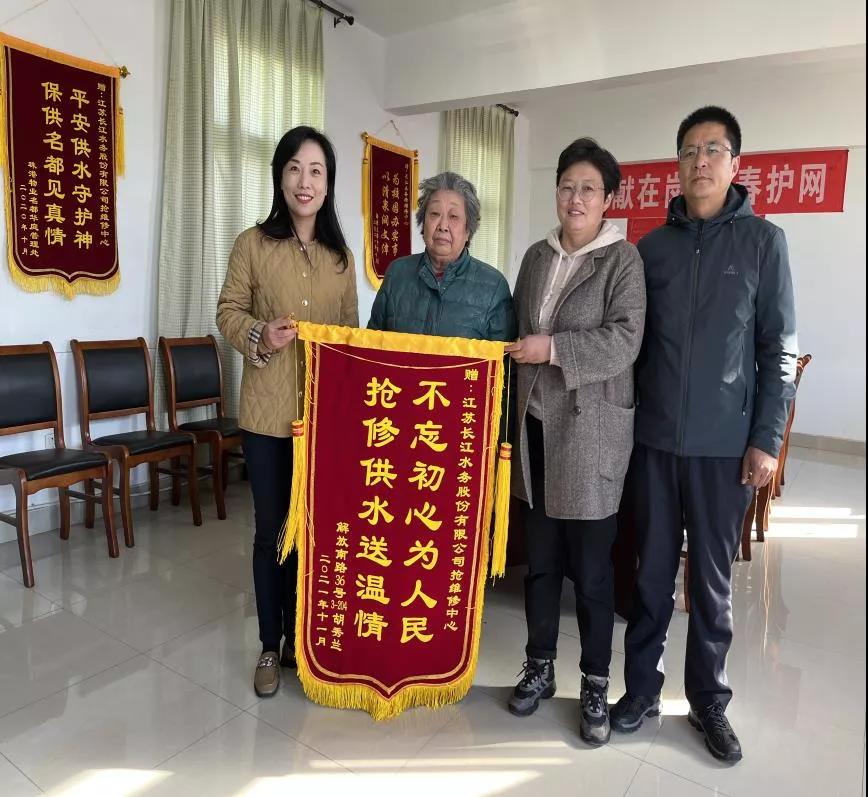 11月10日下午,社區(qū)李主任帶著胡奶奶來(lái)到長(zhǎng)江水務(wù)搶維修中心辦公樓,據(jù)李主任介紹:胡奶奶家人患有重病,經(jīng)濟(jì)較困難,一直在治療中,才從醫(yī)院回來(lái)沒(méi)幾天,就遇上這樣大的事,無(wú)疑給她家中雪上加霜,這一次多虧長(zhǎng)江水務(wù)水網(wǎng)先鋒幫了大忙,然后把胡奶奶寫(xiě)好的感謝信還有寫(xiě)有“不忘初心為人民,搶修供水送溫情”的錦旗贈(zèng)送給部門(mén)負(fù)責(zé)人,并表示這次來(lái)重點(diǎn)是感謝長(zhǎng)江水務(wù)水網(wǎng)先鋒解決胡奶奶的大困難,及時(shí)化解社情矛盾,熱心幫助胡奶奶家度過(guò)難關(guān)。