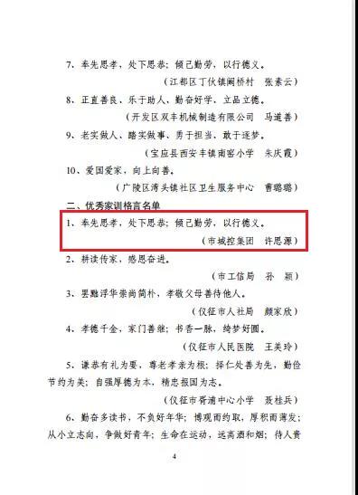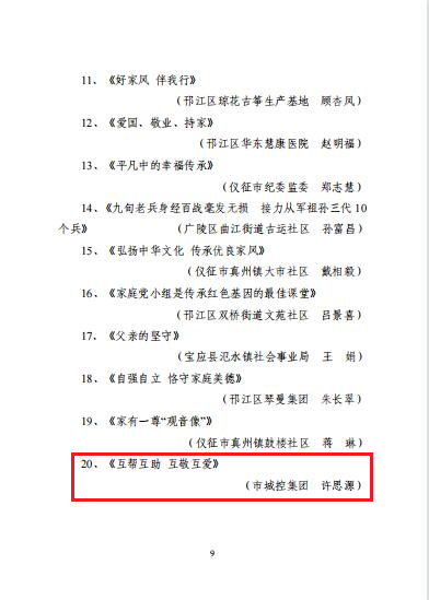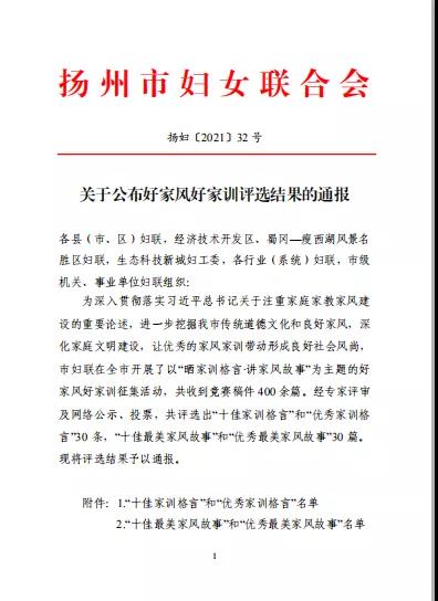 為進(jìn)一步傳承好家訓(xùn)、弘揚(yáng)好家風(fēng),傳播家庭向上向善的正能量,營(yíng)造良好的家庭氛圍,深入推進(jìn)家庭文明建設(shè),城控集團(tuán)行業(yè)婦聯(lián)積極響應(yīng)市婦聯(lián)開展的“曬家訓(xùn)格言.講家風(fēng)故事”為主題的好家風(fēng)好家訓(xùn)征集活動(dòng),在集團(tuán)基層企業(yè)中進(jìn)行了廣泛發(fā)動(dòng),層層篩選,最終共選送了5條家訓(xùn)格言、5個(gè)家風(fēng)故事參評(píng)市婦聯(lián)活動(dòng)。經(jīng)專家評(píng)審和群眾投票評(píng)選,近日,揚(yáng)州市婦聯(lián)對(duì)優(yōu)秀作品進(jìn)行了通報(bào),集團(tuán)共有4個(gè)作品獲評(píng)“優(yōu)秀家訓(xùn)格言”、“優(yōu)秀最美家風(fēng)故事”。