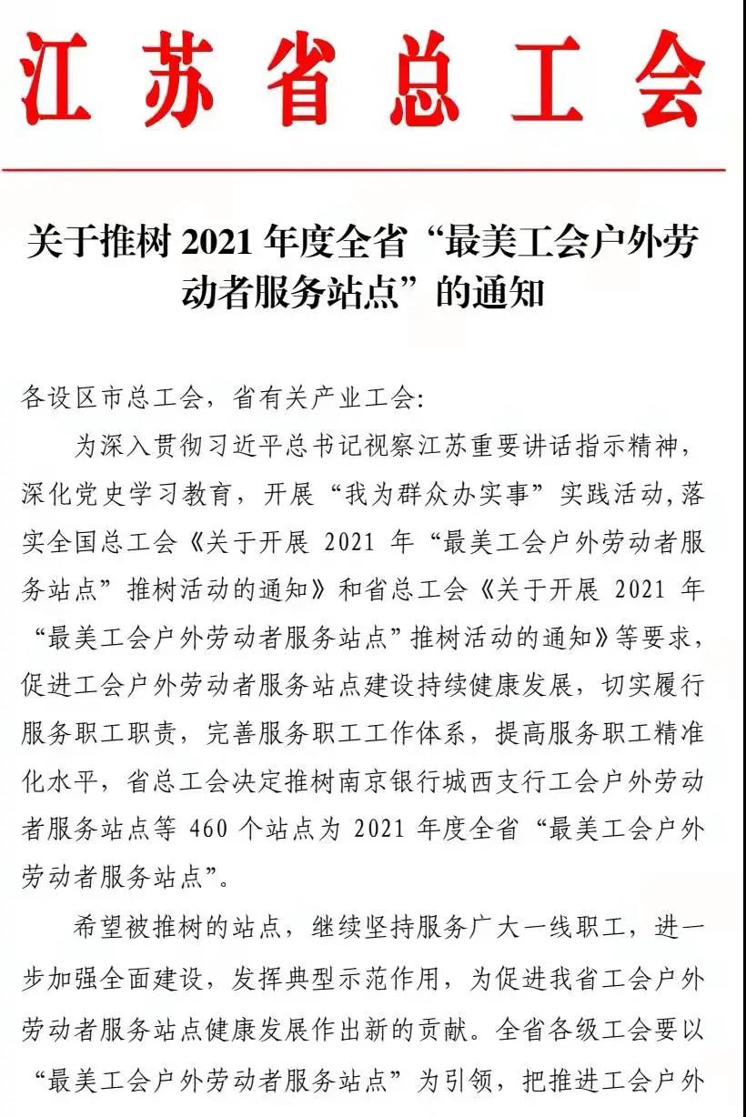 近日,江蘇省總工會(huì)下發(fā)《通知》,推樹2021年度全省“最美工會(huì)戶外勞動(dòng)者服務(wù)站點(diǎn)”,長(zhǎng)江水務(wù)公司寶帶營(yíng)業(yè)廳工會(huì)戶外勞動(dòng)者服務(wù)站點(diǎn)榮登榜單。