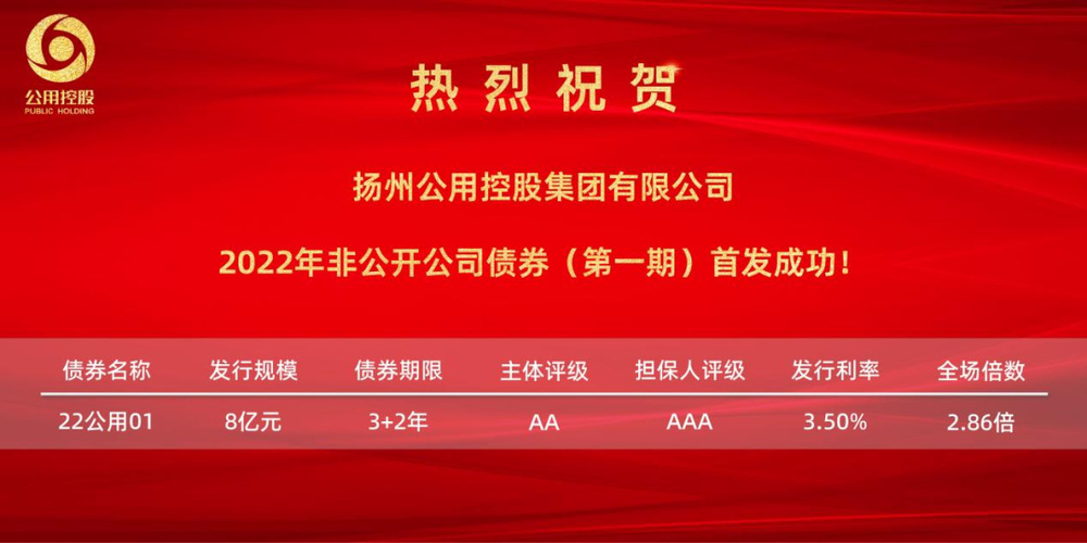 3月9日,揚州公用控股集團有限公司2022年非公開公司債券(第一期)成功發行,發行規模8億元,期限5年,票面利率3.5%。