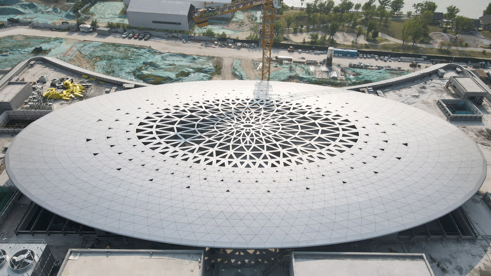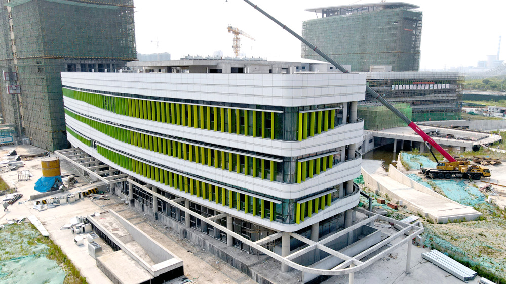 2022年5月,揚州頤和醫療健康中心項目室外裝飾已初具雛形。目前,項目東南裙樓、中間鋼裙樓鋼結構穹頂、北塔樓屋面飄架區域的腳手架及安全網已拆除,外裝飾效果芳容初現。