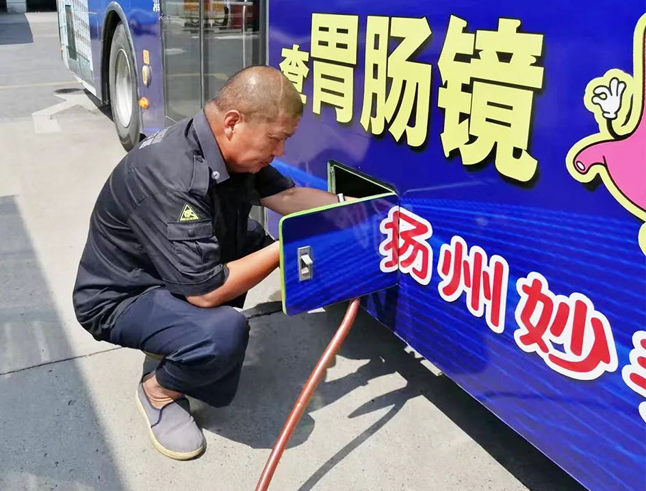 揚(yáng)州中燃公司8座加氣站擔(dān)負(fù)著揚(yáng)州市區(qū)公交車、出租車、網(wǎng)約車等車輛的加氣職責(zé)。連日高溫,車輛開啟空調(diào)后用氣量加大,加氣量由之前的每天5萬立方增至6萬立方。為此,車用氣一方面確保優(yōu)質(zhì)服務(wù),保證車輛隨到隨加,并為駕駛員免費(fèi)提供熱水、微波爐熱飯、大廳空調(diào)休息等服務(wù);另一方面確保安全生產(chǎn),為員工發(fā)放防暑降溫物品,各場站安排員工輪換加氣??瓦\(yùn)東站加氣站沒有加氣大棚,更是高溫難耐,加氣工身上的衣服濕了干、干了濕,衣服上畫滿了鹽漬“地圖”,他們用汗水詮釋責(zé)任,用責(zé)任彰顯擔(dān)當(dāng)。打開后備箱檢查隱患、插槍加氣等操作流程一絲不茍,以實(shí)際行動落實(shí)燃?xì)獍踩鞍偃招袆印薄?/p>