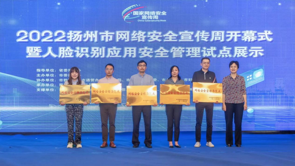 9月6日上午,2022揚州市網絡安全宣傳周開幕式暨人臉識別應用安全管理試點展示會在揚州市迎賓館順利召開。開幕式上,城控集團公用事業服務北區營業廳(市民卡鴻福營業廳)獲得“網絡安全示范點”授牌。