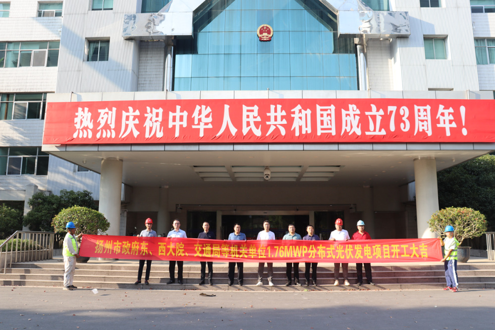 10月2日,由潔源光伏公司投資建設的揚州市政府東、西大院、交通局等公共機構屋頂1.76兆瓦分布式光伏發電項目開工儀式在揚州市政府西大院舉行。揚州市機關事務局、揚州市機關服務中心、潔源光伏公司相關負責人及工程參建單位有關代表參加了開工儀式。