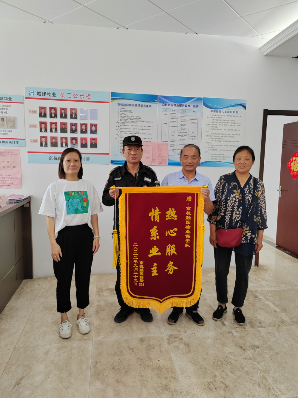 王大哥夫婦再三夸贊京杭融園項目部的保安師傅熱心、貼心、親切,王大哥表示,這么多年了,看著物業(yè)的服務(wù)越做越好,看著工作人員點點滴滴的付出,疫情期間的堅守,這才想著送來這面錦旗。