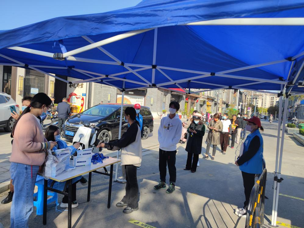 10月24日,在吾悅樸墅東門核酸檢測服務(wù)點,“e飛揚”志愿服務(wù)隊志愿者正在協(xié)助專業(yè)人員進行信息登記、秩序維護、采樣咨詢服務(wù),這是服務(wù)隊兩周來第3次助力社區(qū)核酸檢測。