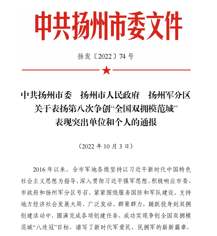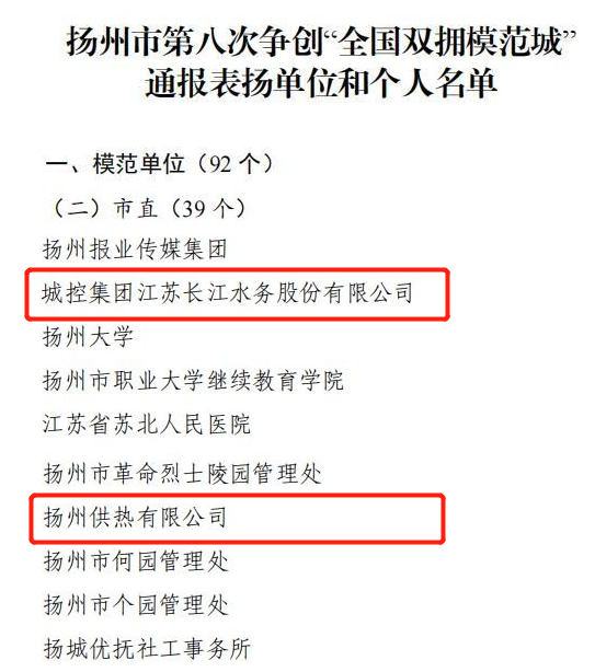 近日,揚州市市委、市政府、軍分區(qū)印發(fā)《關(guān)于表揚第八次爭創(chuàng)“全國雙擁模范城”表現(xiàn)突出單位和個人的通報》,城控集團所屬江蘇長江水務(wù)股份有限公司、揚州供熱有限公司兩家單位榮獲爭創(chuàng)“全國雙擁模范城”表現(xiàn)突出單位。