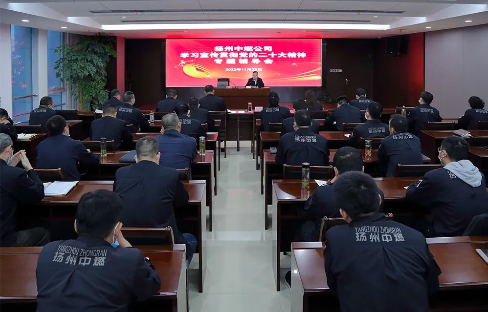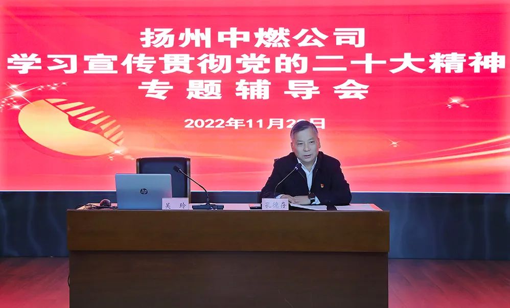 為深入學習宣傳貫徹黨的二十大精神,把揚州中燃公司廣大黨員、干部員工的思想統一到黨的二十大精神上來,把力量凝聚到推動揚州中燃公司轉型跨越發展的方向上來,2022年11月22日下午,揚州中燃公司黨委組織開展學習宣傳貫徹黨的二十大精神專題輔導會。會議傳達學習了《中共中央關于認真學習宣傳貫徹黨的二十大精神的決定》,對全公司學習宣貫黨的二十大精神進行動員部署,邀請市委黨校吳玲老師宣講黨的二十大精神。公司領導班子成員,全體中層干部參加會議。