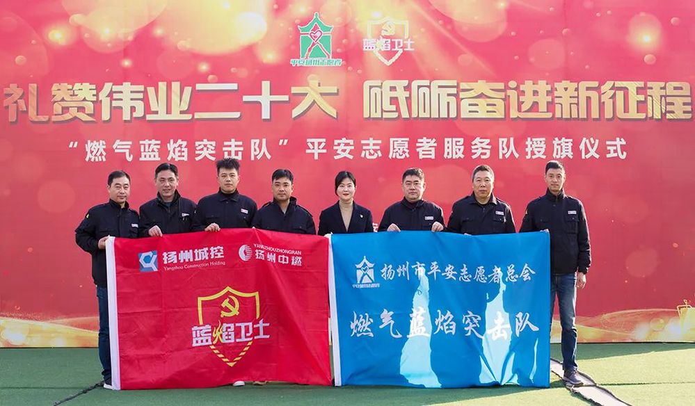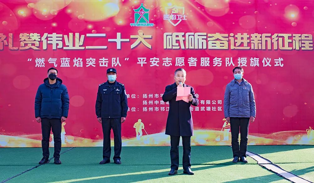 為貫徹黨的二十大精神,筑牢燃?xì)獍踩谰€,為建設(shè)平安揚(yáng)州夯實(shí)基礎(chǔ),12月15日,揚(yáng)州市平安志愿者總會、揚(yáng)州中燃公司在邗上街道武塘社區(qū)中心廣場,共同組織開展“禮贊偉業(yè)二十大、砥礪奮進(jìn)新征程”平安志愿服務(wù)活動暨“燃?xì)馑{(lán)焰突擊隊(duì)”授旗儀式。揚(yáng)州市公安局二級高級警長、揚(yáng)州平安志愿者總會副會長俞洪出席活動,為“燃?xì)馑{(lán)焰突擊隊(duì)”平安志愿服務(wù)隊(duì)授旗。揚(yáng)州中燃公司黨委書記、董事長,燃?xì)獍矙z員代表參加活動。