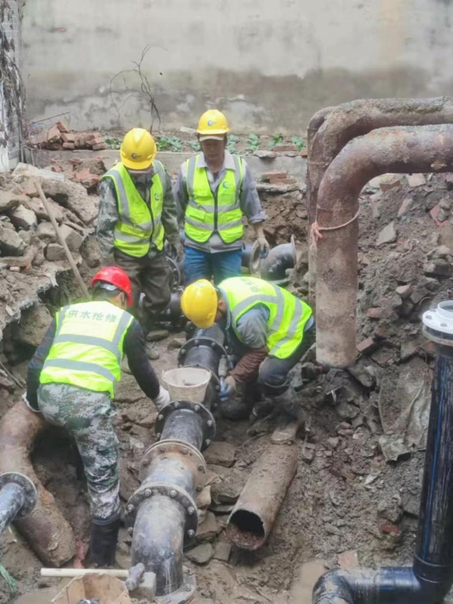 長江水務第三黨支部“水網先鋒突擊隊”在此次搶修任務中擔當工作骨干,他們平時每天24小時值守崗位,哪里有管道搶修,他們就出現在哪里!他們出動及時處理得當,用了5個小時就完成閘門止水、土方開挖、管道更換等工作,為小區居民恢復了供水。