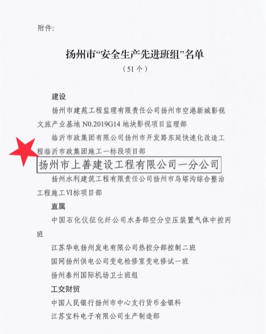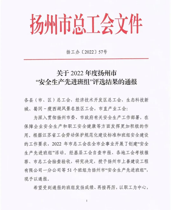 上善公司深入貫徹揚州市委、市政府、城控集團有關安全生產工作部署,在保障企業安全生產和職工安全健康等方面發揮積極作用。近日,市總工會發文表彰了2022年度市“安全生產先進班組”,上善公司一分公司在此次評選中脫穎而出,被授予該項榮譽稱號。