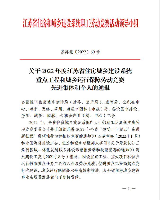 12月30日,從江蘇省住房和城鄉(xiāng)建設(shè)系統(tǒng)職工勞動(dòng)競(jìng)賽活動(dòng)領(lǐng)導(dǎo)小組傳來喜訊,揚(yáng)州市潔源排水有限公司被表彰為“2022年度江蘇省住房城鄉(xiāng)建設(shè)系統(tǒng)重點(diǎn)工程和城鄉(xiāng)運(yùn)行保障勞動(dòng)競(jìng)賽先進(jìn)集體”。