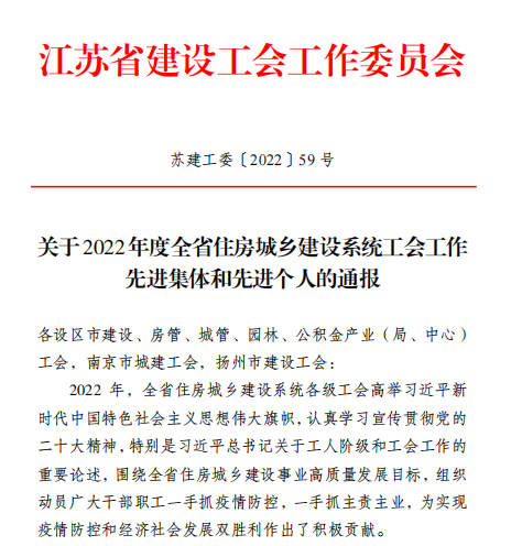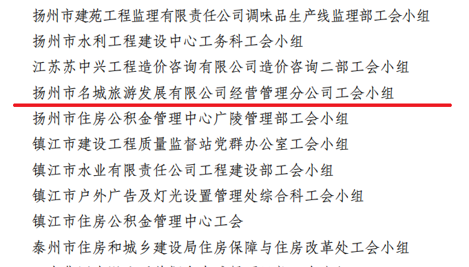 2022年12月30日,江蘇省建設(shè)工會工作委員會發(fā)文表彰省住房和城鄉(xiāng)建設(shè)系統(tǒng)先進(jìn)集體,揚(yáng)州市名城旅游發(fā)展有限公司聯(lián)合基層工會經(jīng)營管理分公司工會小組被表彰為“模范職工小家”稱號。