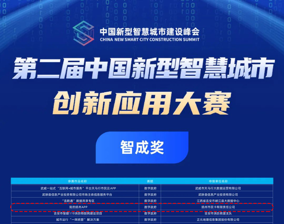 近日,中國新型智慧城市建設峰會在線上順利召開,本次峰會由國家信息中心、青島市人民政府、山東省大數據局聯合主辦。會上公布了峰會配套創新應用大賽獲獎結果,本屆大賽聚焦行業領域突出應用成效和創新建設理念,設置了行業賽道和創新賽道。由揚州城控集團市民卡公司申報的“我的揚州APP”從全國18省50市的1000余個優秀項目中脫穎而出,榮獲“智成獎”。