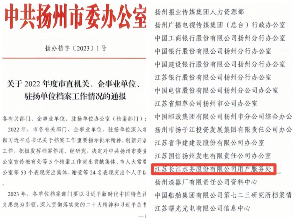 近日,長(zhǎng)江水務(wù)公司用戶服務(wù)處獲得中共揚(yáng)州市委辦公室頒發(fā)的“2022年度檔案工作表現(xiàn)突出集體”榮譽(yù)稱號(hào)。