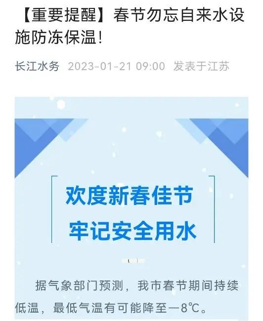 寒潮降溫前,長江水務未雨綢繆,提前準備,加強防凍保溫宣傳,加密信息發布頻次,有效做好防范工作。春節前和春節期間通過手機APP、微信公眾號、電視滾動字幕等渠道,密集發布30多條自來水設施防凍保溫提醒和安全用水服務通知,全方位提醒居民提前防范。