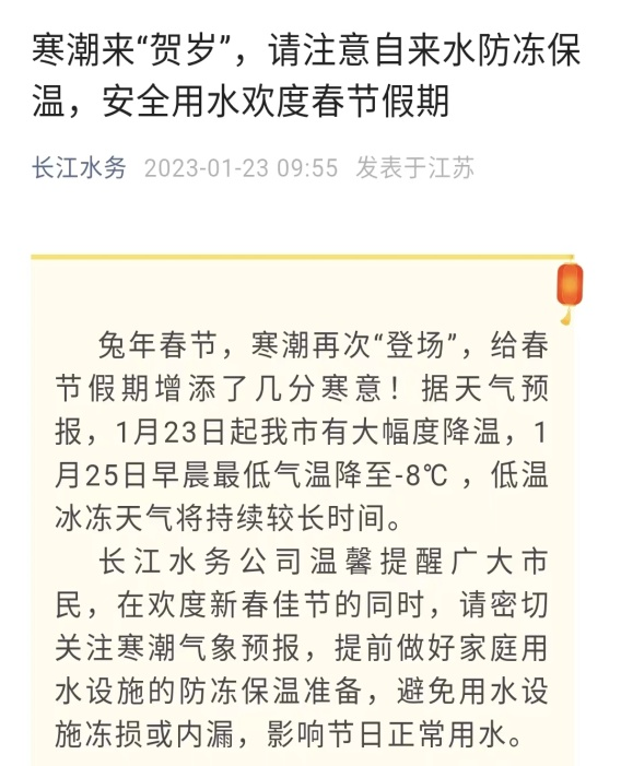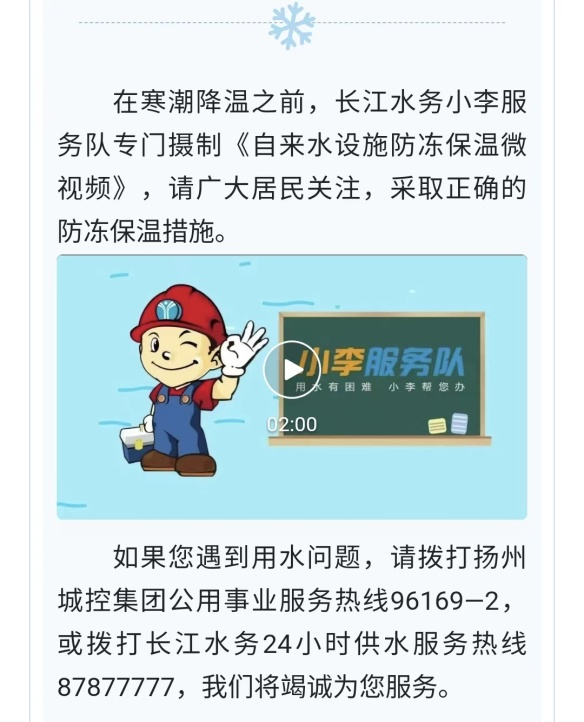 兔年春節假期我市遭遇持續寒潮天氣,有嚴重冰凍,為保證市民用戶正常用水,長江水務一方面通過媒體、微信公眾號等平臺密集發布寒潮預警,提前宣傳水表水管防凍保溫方法,另一方面由抄表員在各社區群、業主群里發送防凍提醒,特別提醒離揚的市民在出門前關閥排空防凍,做好防凍保溫準備。長江水務“小李服務隊”加強春節值班值守,奔赴各居民小區,積極為居民提供維修服務。