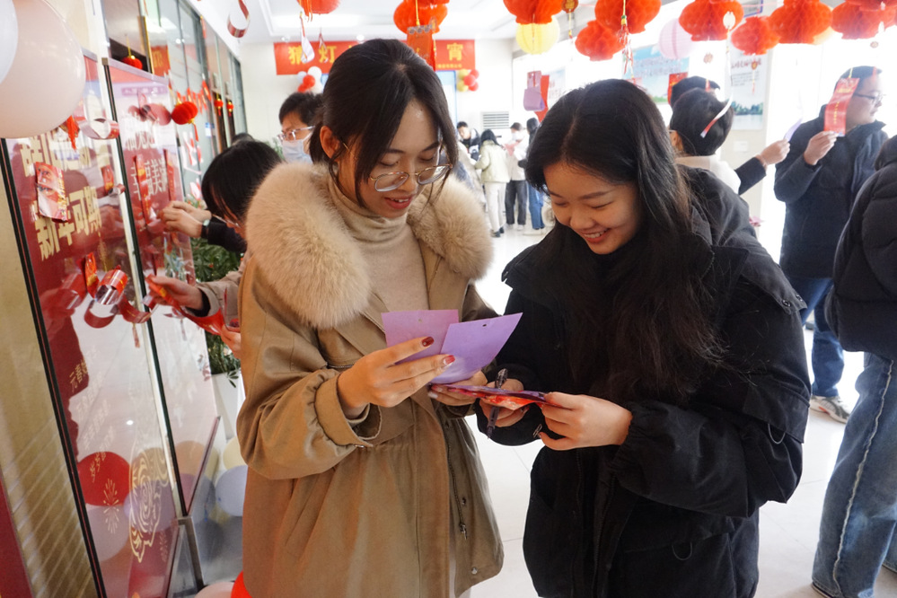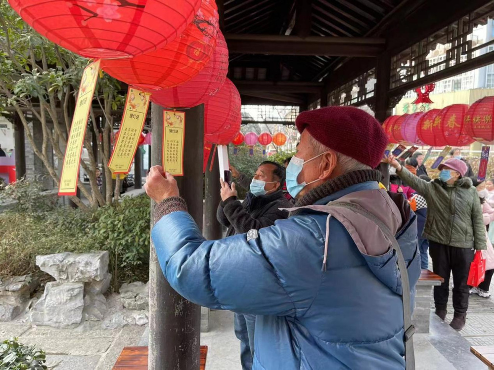 猜燈謎是元宵節不可缺少的環節。活動現場,一排排彩紙燈謎隨風飄揚,參與者認真討論,沉著思考,爭做最強大腦。