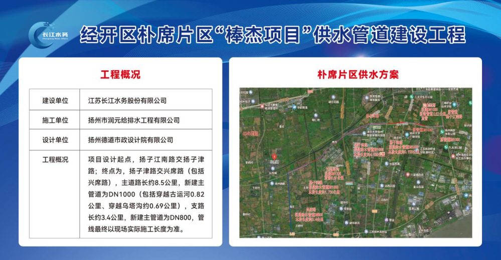 “棒杰項目”是揚州經濟技術開發區重點招商引資項目,為配合項目建設,長江水務高度重視,迅速部署,成立工作專班積極推進項目建設。目前,樸席片區“棒杰項目”專項供水管道建設設計起點為揚子江路與揚子津路交叉口,設計終點為興席路與春江路交叉口。其中,擬在揚子津路(邗江路-興席路)新建DN1000供水管道約8.5公里,概算投資7000萬元。
