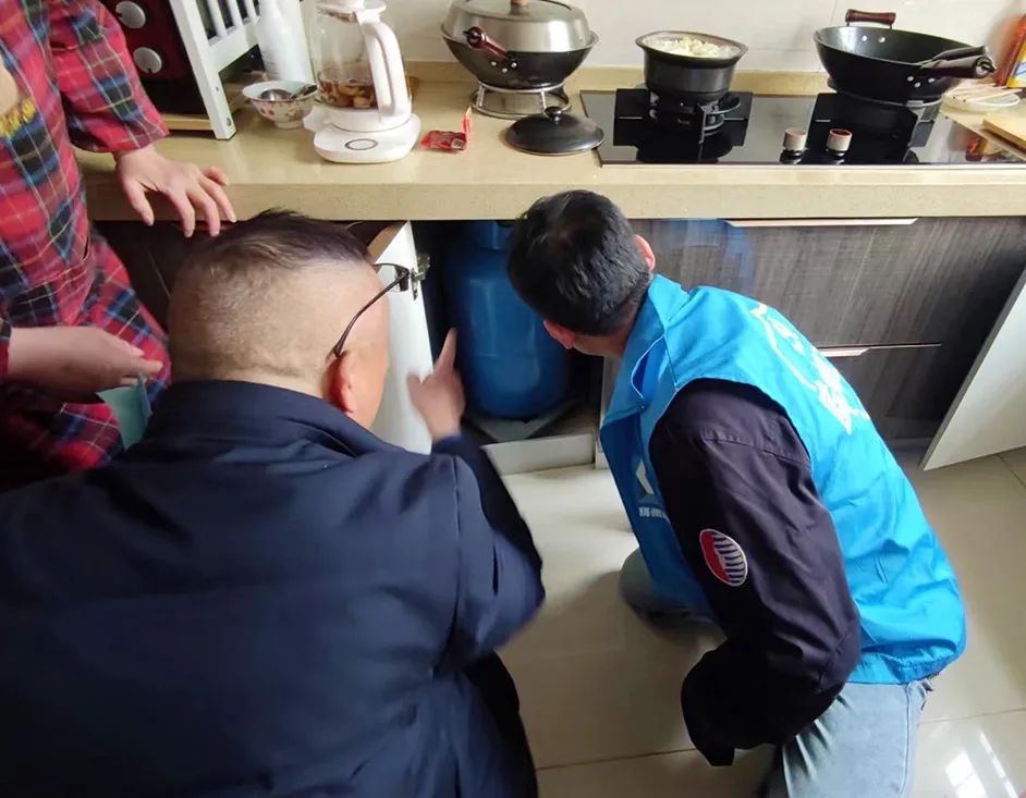 此次活動設在新橋華庭別墅(莊臺)區,群眾最擔心就是家中是否符合安裝條件。藍焰衛士分批上門進行查勘。在居民佘女士家中,其現在使用的集成灶進氣處與天然氣入戶管道相反,且安裝位置受限,藍焰衛士們群策群力,共同為佘女士提供優化解決方案。