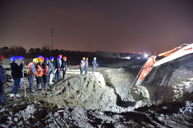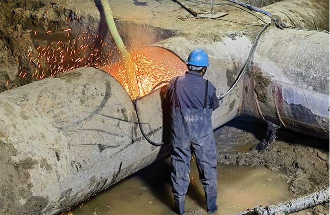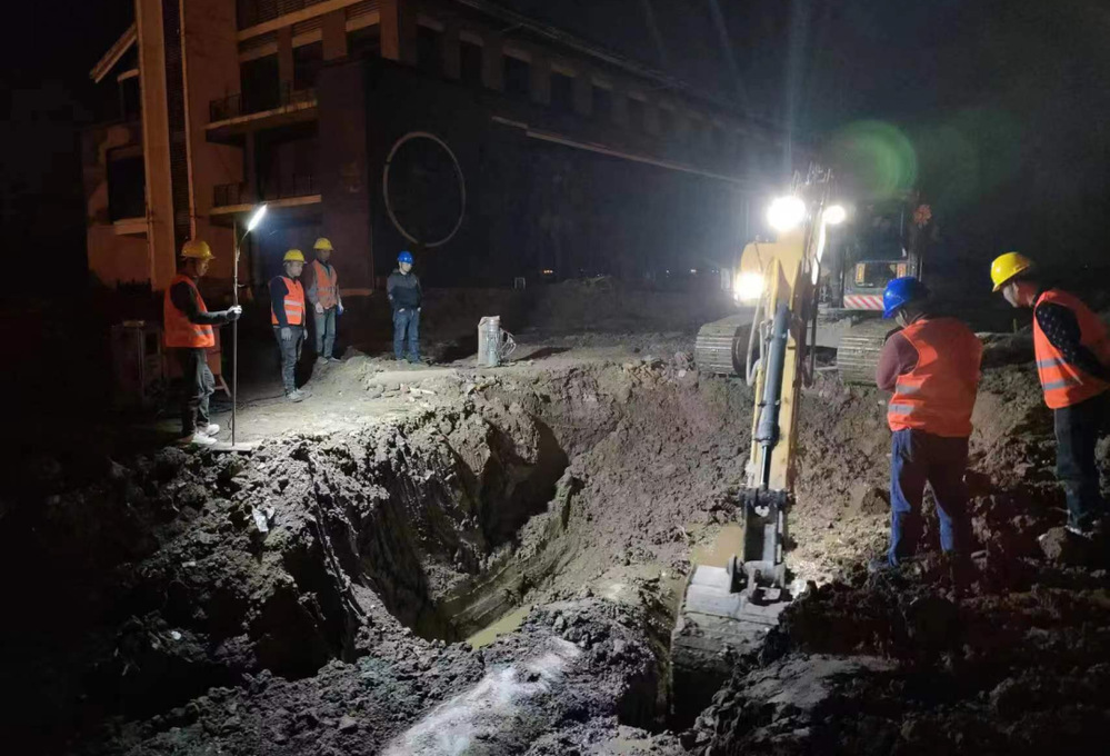 公司領導在施工現場靠前指揮,潤元公司、搶維修中心施工人員提前進場,采用挖掘機等大型機械打開作業坑,及時開挖好管道溝槽,備好管件材料,并做好管道改移的其他各項準備。28日晚8點,閘門關閉,經過4小時泄壓、排水后,4處碰接點同時作業。挖掘機的轟鳴聲此起彼伏,施工人員有序地忙碌著,陽春三月乍暖還寒,施工人員不顧寒冷刺骨的水流迅速進入作業坑中,對舊管道進行切割,隨后打通新設鋪管道并焊接悶板,此時已是深夜,施工人員為了盡早恢復供水,他們挑燈夜戰、攻堅克難、爭分奪秒,始終以飽滿的工作熱情堅守在施工一線。