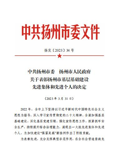 近日,揚州市委、市政府發(fā)布《關(guān)于表彰揚州市基層基礎(chǔ)建設(shè)先進(jìn)集體和先進(jìn)個人的決定》,表彰了過去一年在“強(qiáng)富美高”新?lián)P州建設(shè)中,在加強(qiáng)基層基礎(chǔ)建設(shè)、深化基層黨建引領(lǐng)、強(qiáng)化宣傳思想工作、抓緊抓牢安全生產(chǎn)、持續(xù)提升綜合治理能力等多個方面涌現(xiàn)出的一批銳意進(jìn)取、改革創(chuàng)新、勇于擔(dān)當(dāng)、善于作為的先進(jìn)集體和先進(jìn)個人。