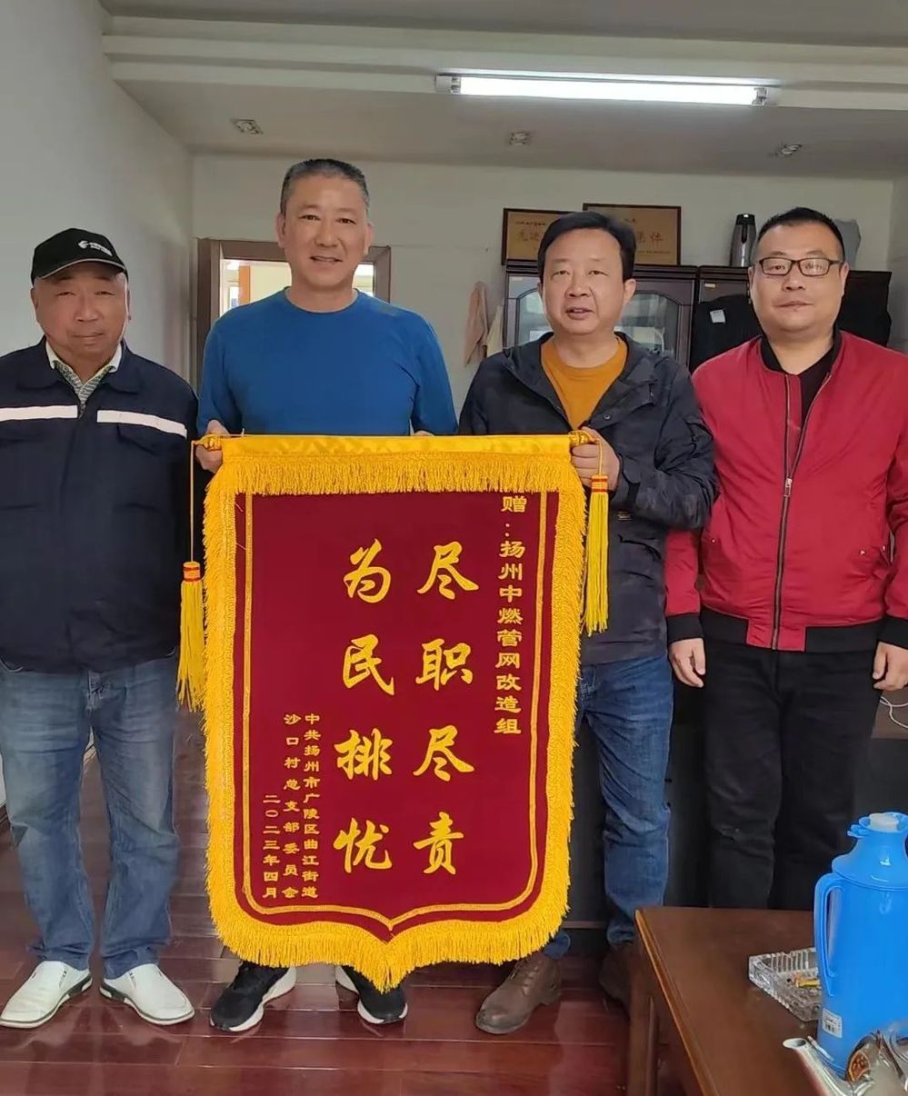 2023年4月23日,曲江街道沙口村總支部代表來到揚州中燃公司,贈送了一面“盡職盡責,為民排憂”的錦旗,以表達對燃氣管道改造施工人員在沙口村老舊燃氣管道改造中無“微”不至、專業周到的貼心服務表示感謝!