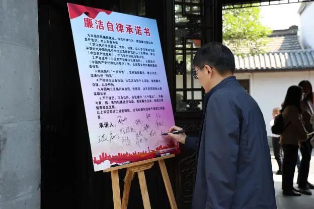 在斗野亭的長廊,大家分享了廉政書籍,互贈了“廉”花,進行了廉政交流,簽署了廉潔自律承諾書。大家紛紛表示:“在今后的工作生活中,要一身正氣、堅守本心;要頭頂理想、胸懷信仰;要主動擔當、知行合一。”