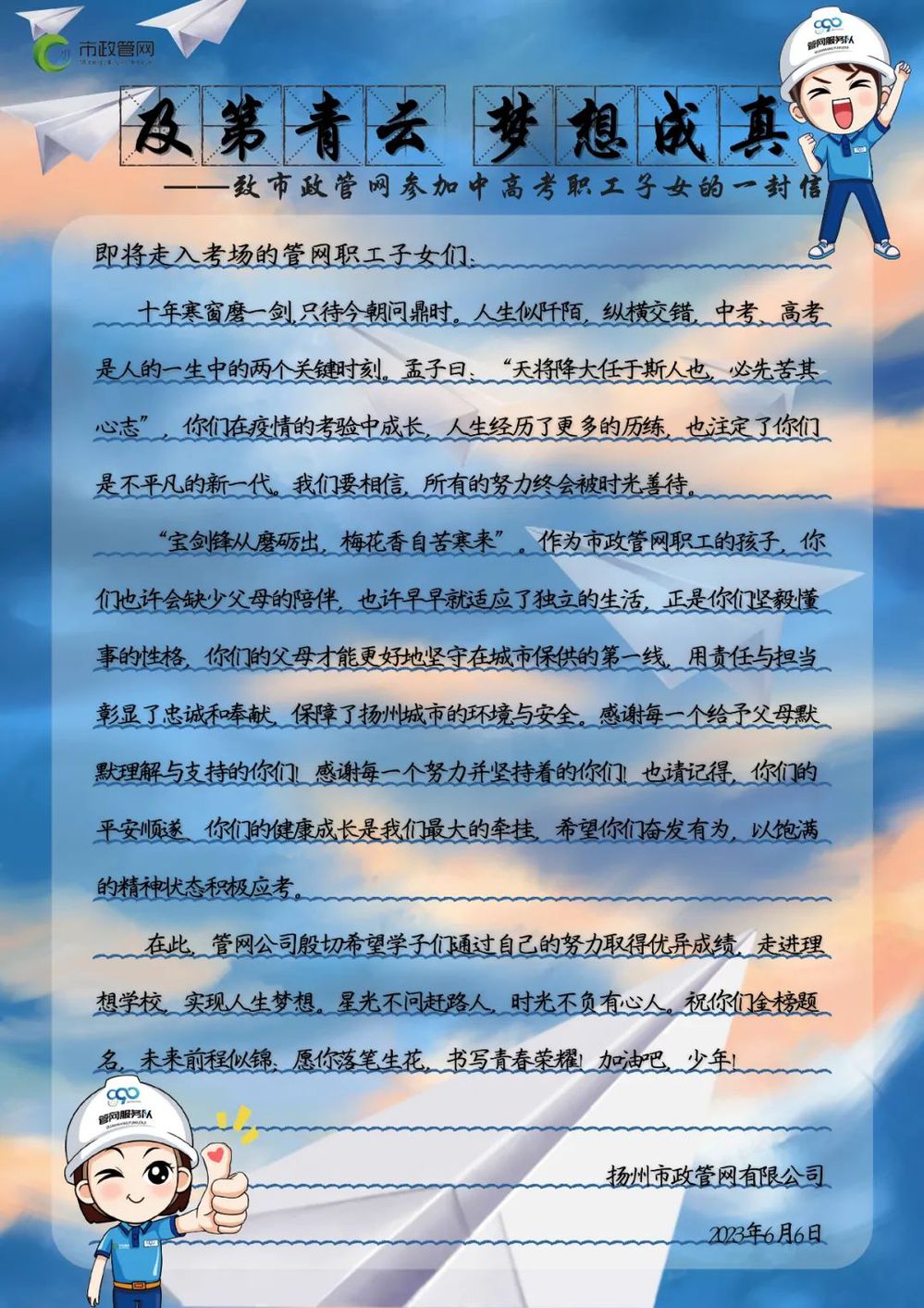 中高考是人生的重要時(shí)刻,也是每個(gè)家庭的共同期待。為了緩解考生及家長(zhǎng)的壓力,給學(xué)子送去誠(chéng)摯的祝福,近日,管網(wǎng)公司為“家有考生”的4名職工送上了一份寓意“一舉糕粽”“金榜題名”的祝福禮盒和一封《致中、高考學(xué)子的慰問(wèn)信》。