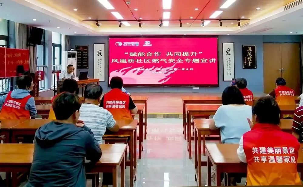 在社區活動室,來自鳳凰橋社區的黨員代表、網格員、微網格員30多人參加活動。藍焰融惠志愿者通過講解PPT、播放宣傳片的形式,從“如何進行燃氣安全自檢、用氣安全隱患分析、燃氣泄漏與事故發生的關聯度、用氣存在的不安全行為、燃氣泄漏應急處置措施”等方面進行了深入淺出的講解。志愿者現場就安裝金屬軟管等安全保護裝置的必要性、落實開窗通風這一最簡單最有效的方法與大家進行了答疑和交流。