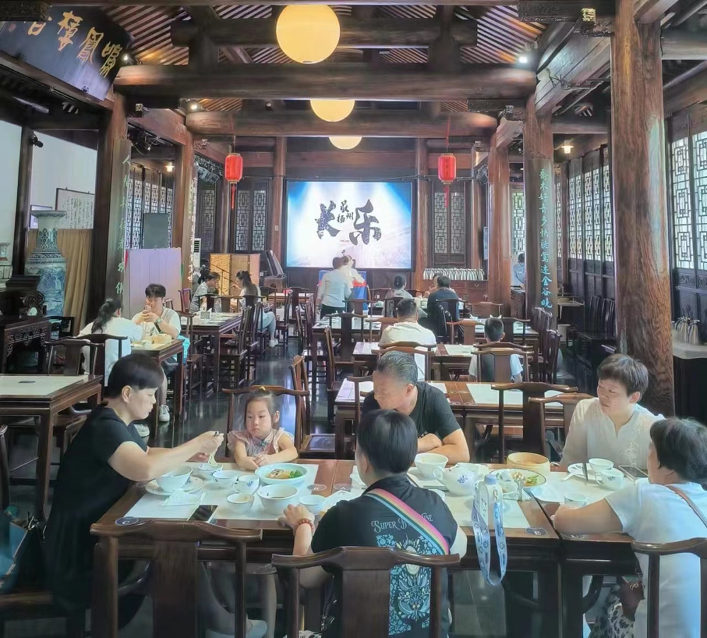 清晨,柔和的晨曦透過長(zhǎng)樂客棧的軒窗,清幽與靜美在光影之間盡情流露。陣陣香氣在空氣中彌漫,一壺綠楊春,一盤燙干絲,現(xiàn)蒸的點(diǎn)心相繼擺上桌,一場(chǎng)早茶盛宴拉開帷幕。8月25日早晨,揚(yáng)州新聞女生走進(jìn)長(zhǎng)樂客棧酒店,與大家共同打卡藏在古街里的淮揚(yáng)園林早茶。