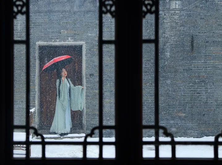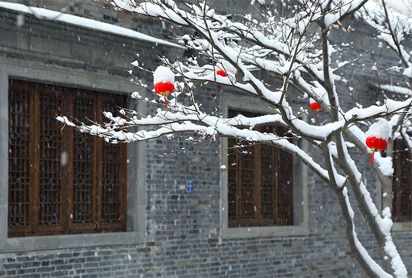 大雪覆蓋了瓦頂巷尾、城樓墻面、燈籠乃至樹枝,雪的作品終于完成了。
