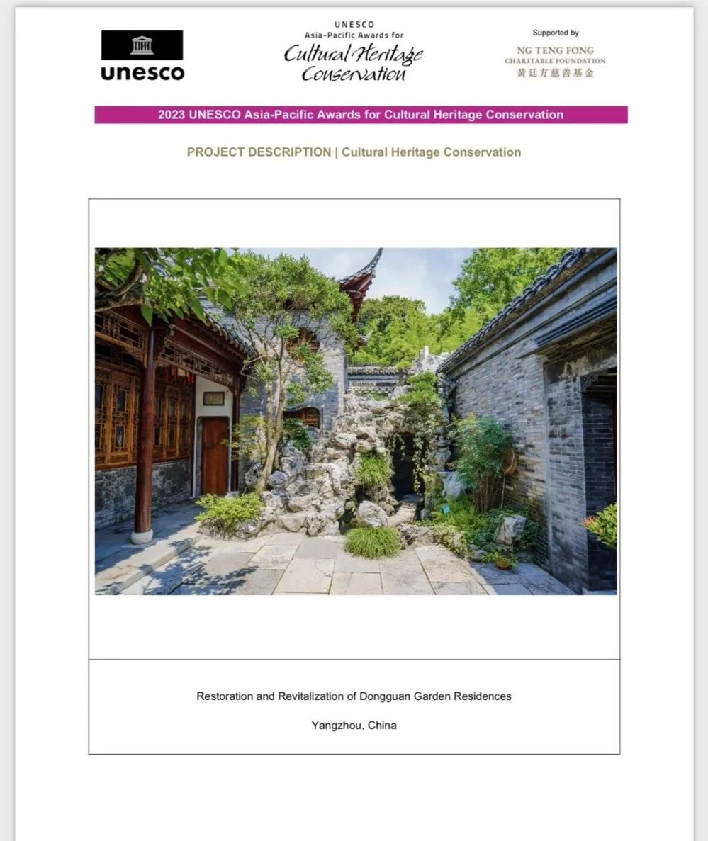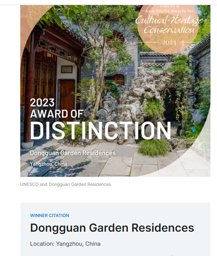 由揚州市住房和城鄉(xiāng)建設局組織,揚州市名城建設有限公司牽頭申報的“揚州東關街園宅保護與傳承復興項目”榮獲2023年度“聯(lián)合國教科文組織亞太地區(qū)文化遺產保護杰出獎”。此次共有從來自亞洲地區(qū)和太平洋沿岸地區(qū)的8個國家、48個城市項目申報,最終有12個項目獲獎。