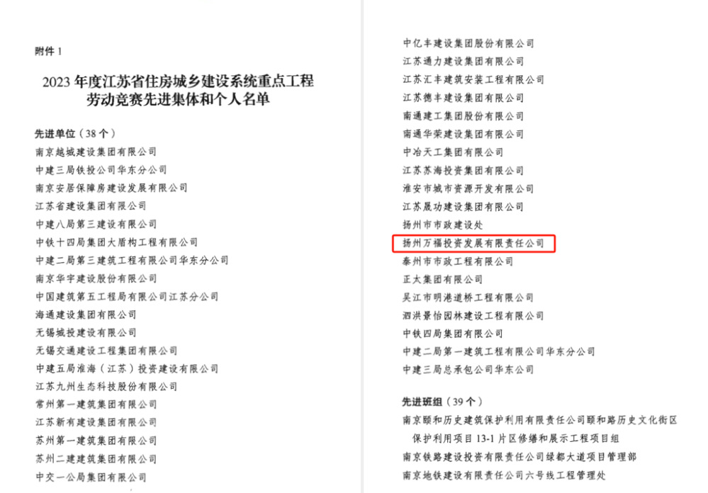 近日,萬福公司被授予 “2023年度省住建系統重點工程勞動競賽先進單位”榮譽稱號。